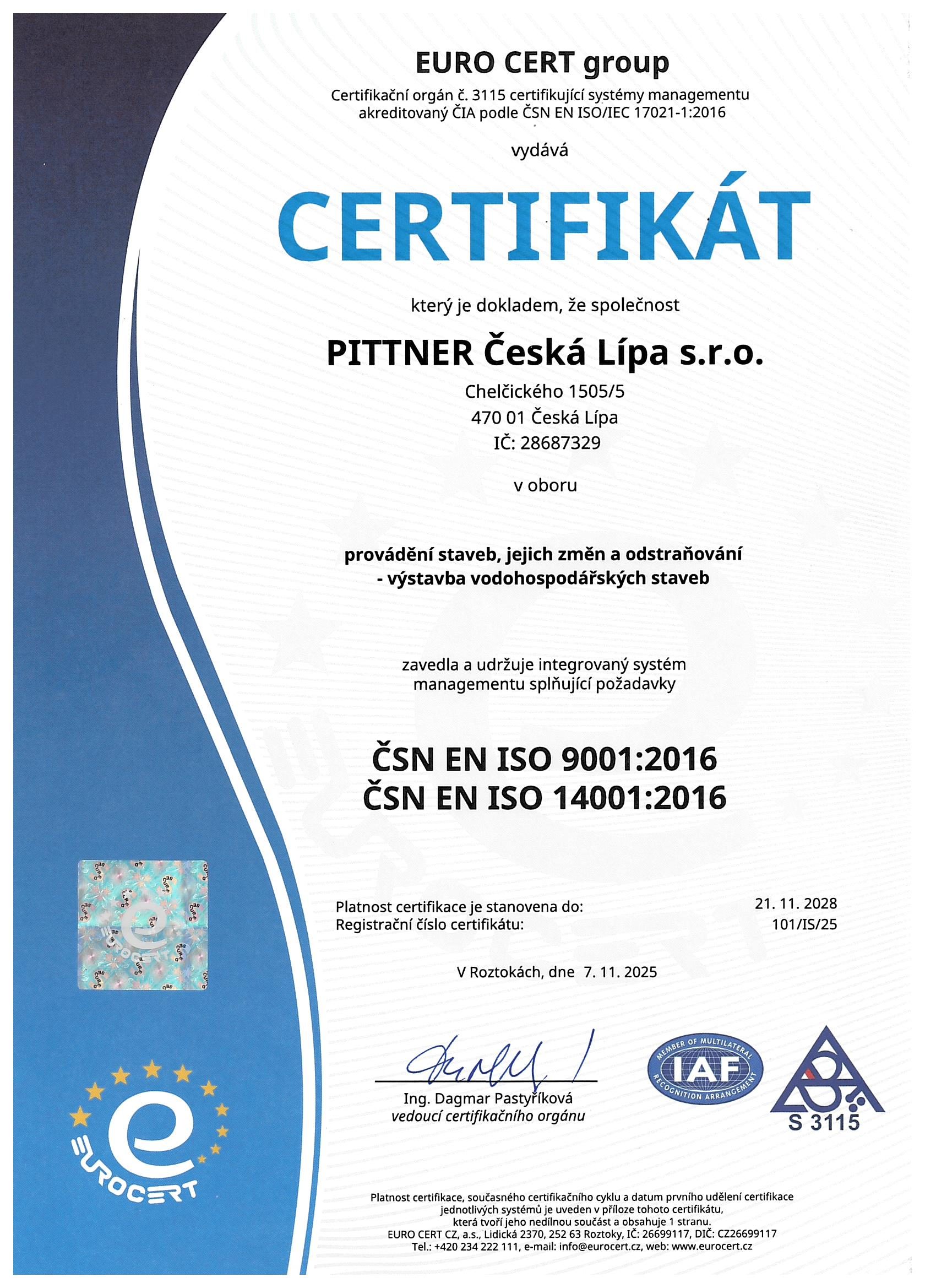 V červenci roku 2004 jsme získali CERTIFIKÁT č. 3115, který potvrzuje, že organizace má zaveden a udržován systém jakosti odpovídající požadavkům ČSN EN ISO 9001:2009 v oblasti provádění staveb včetně jejich změn. Certifikaci prováděla společnost EURO CERT CZ, a.s., Lidická 531, Roztoky.